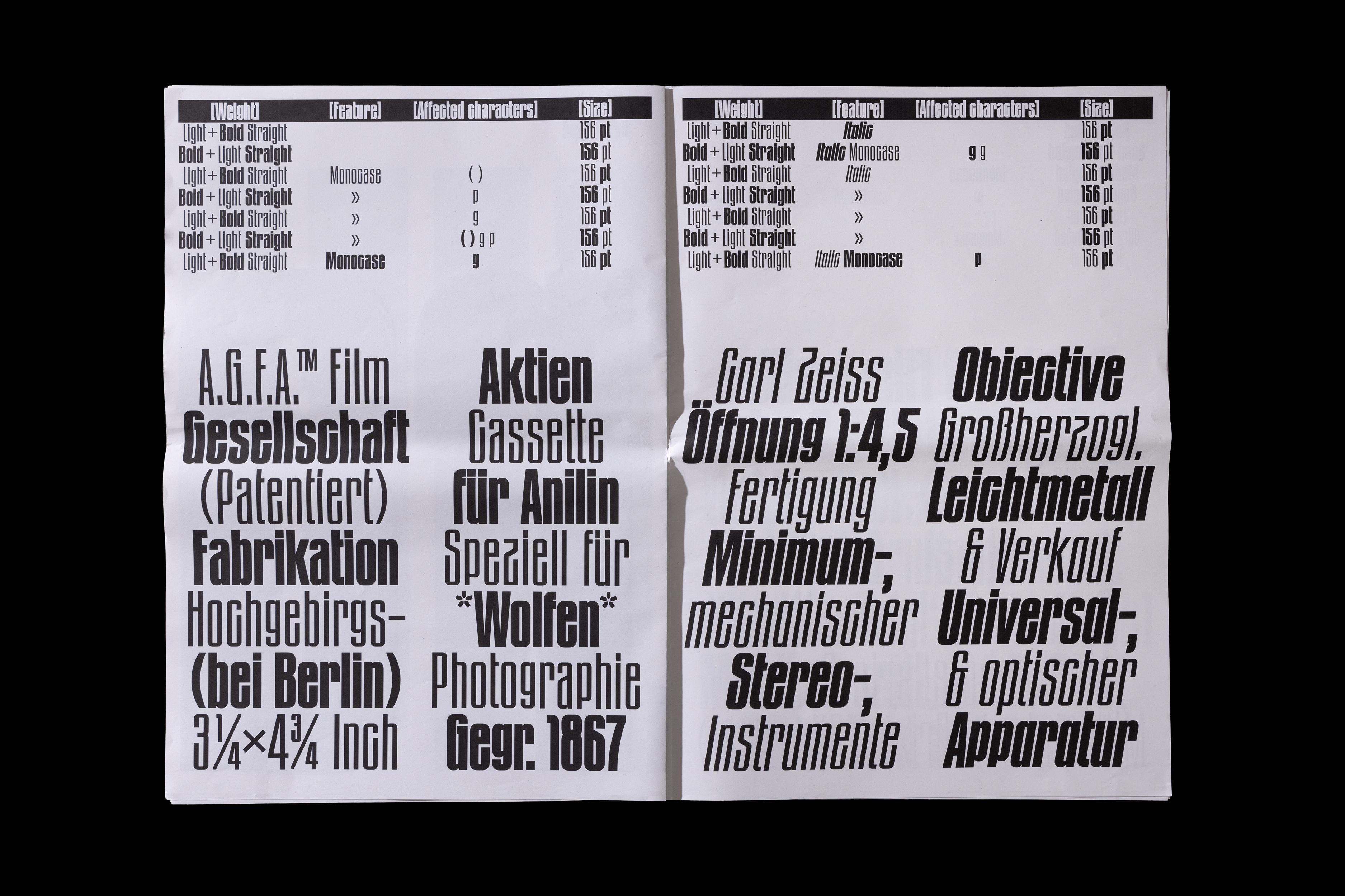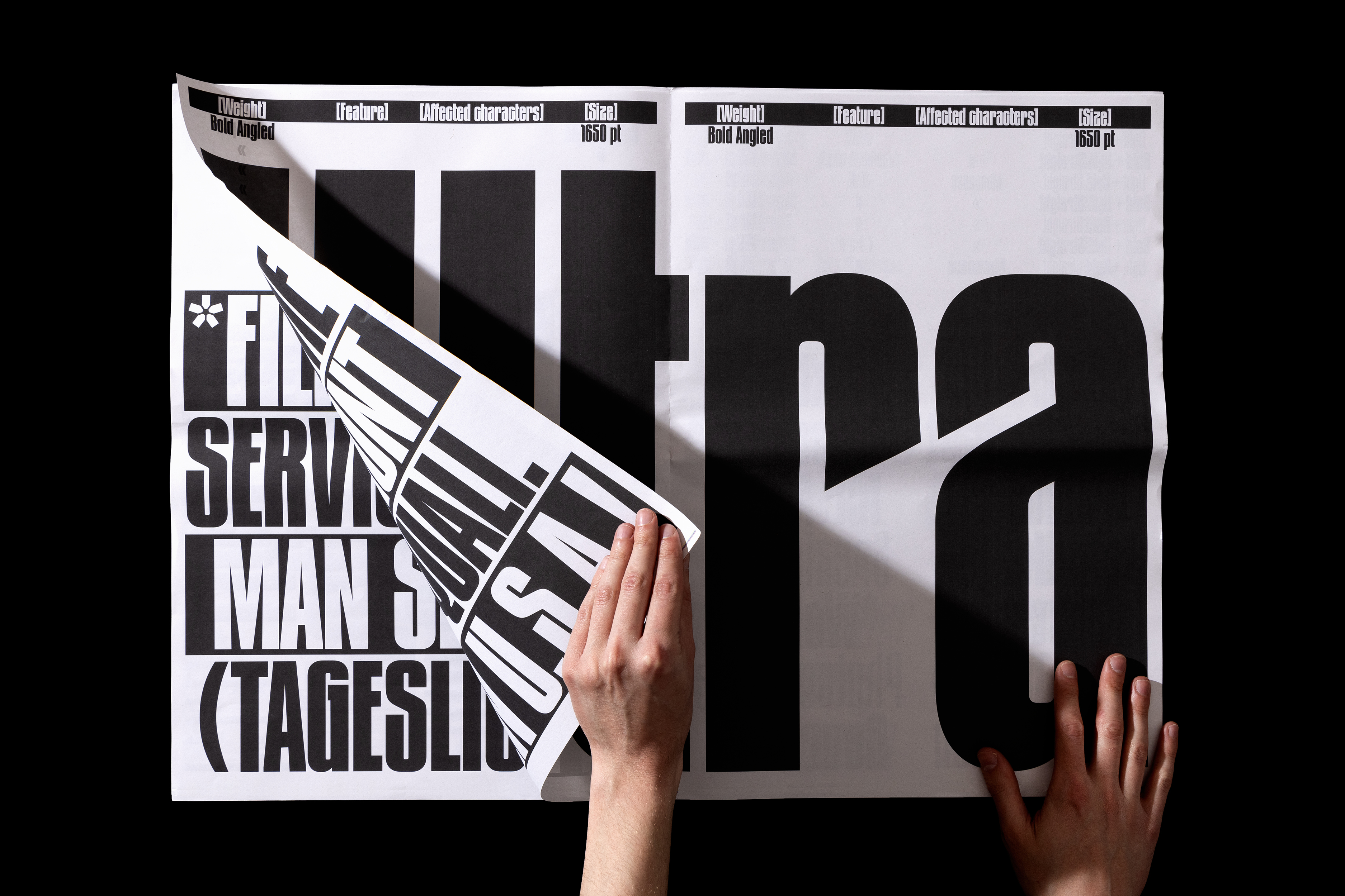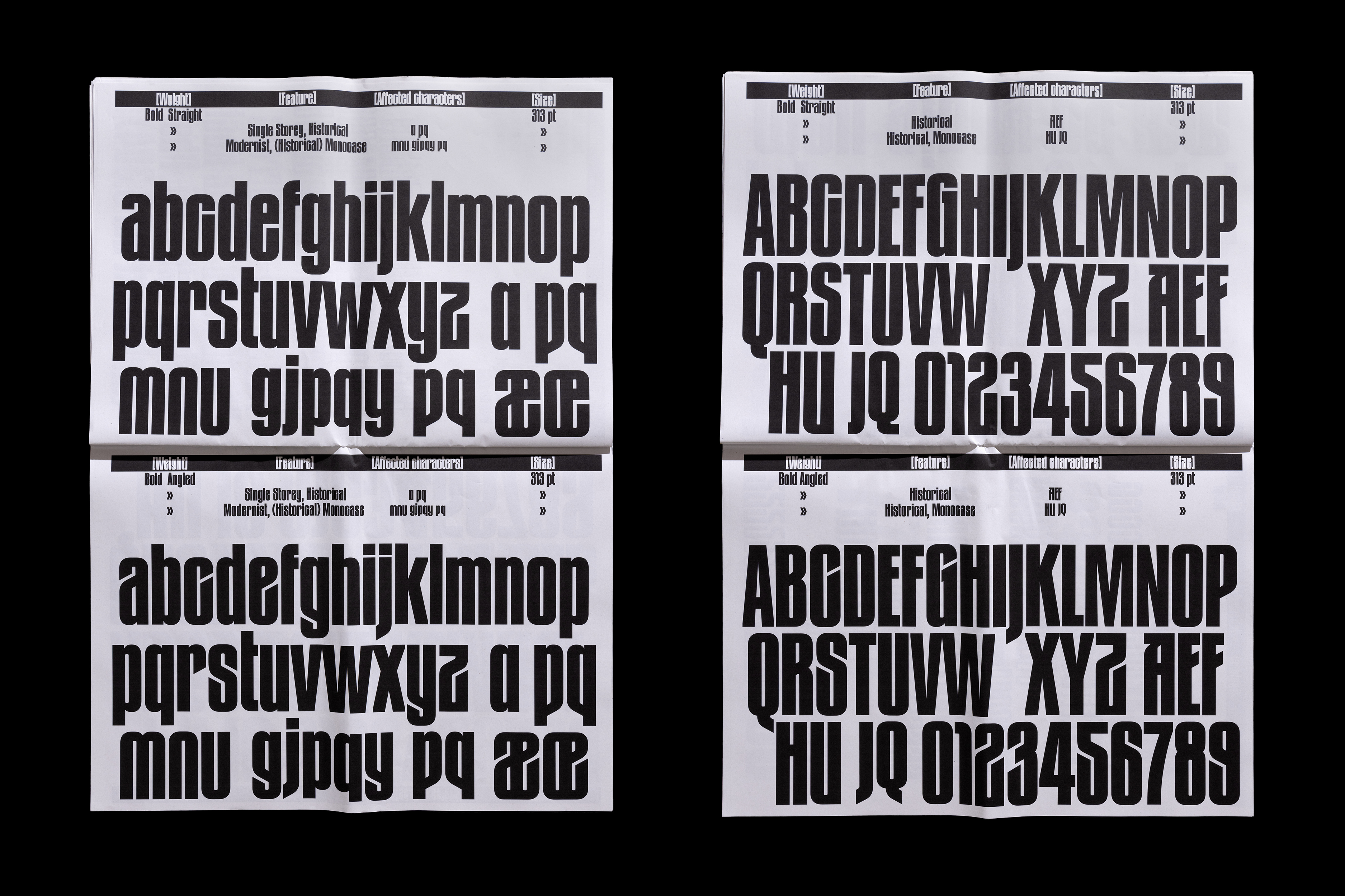 The typeface was created after Thomas found some old metal letters of a typeface entitled »Zeitungs-Grotesk« by the Bauer foundry from 1906. He was immediately fascinated by its art nouveau influences such as the uppercase »A«, diagonal endings, dense construction and interconnection. The original »Bold Angled« style has been complemented by lighter weights, italics and an entire family with straight endings making it a versatile family for a wide variety of display usage. OpenType features such as a monospace feature allows tight line spacing and creative typesetting.