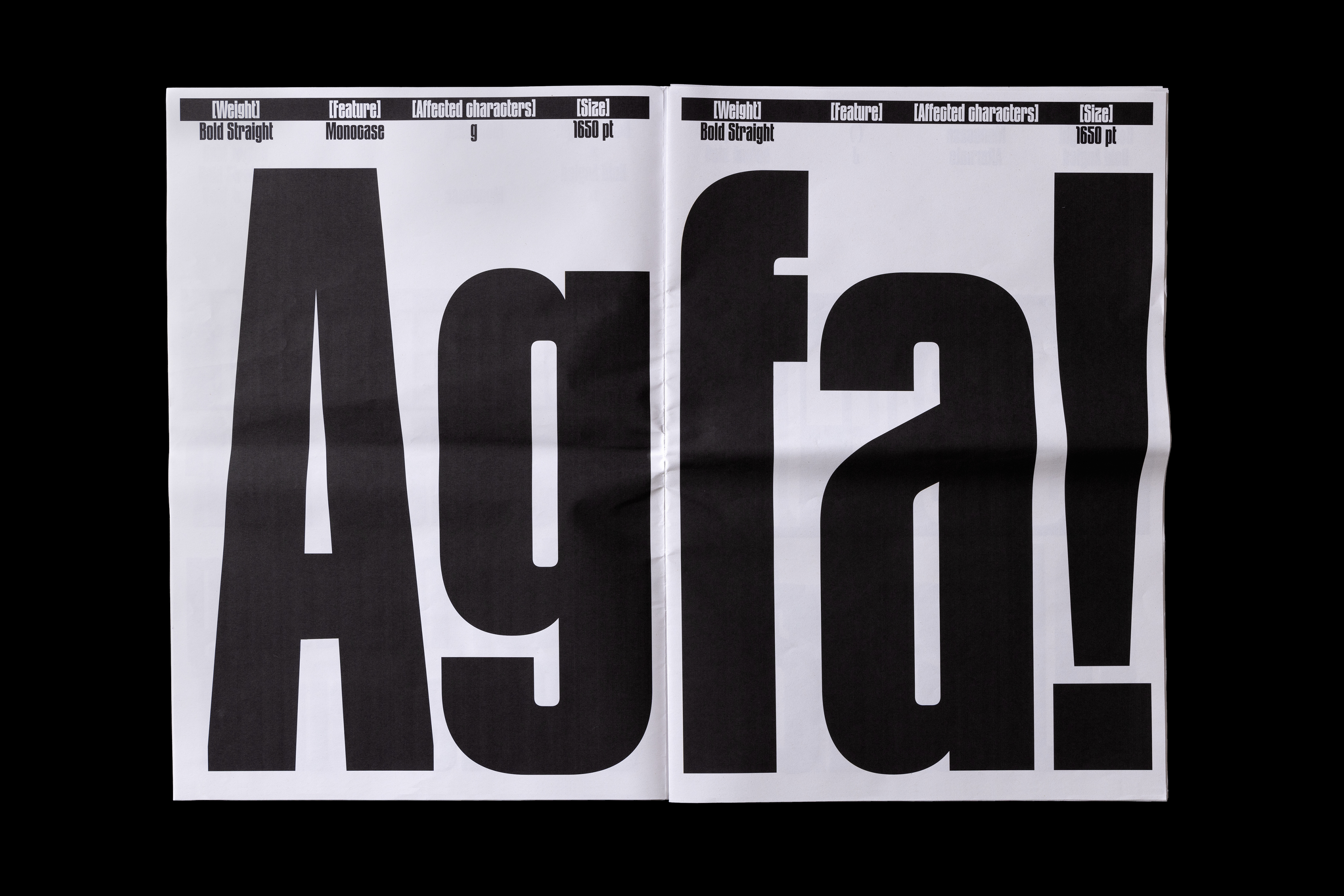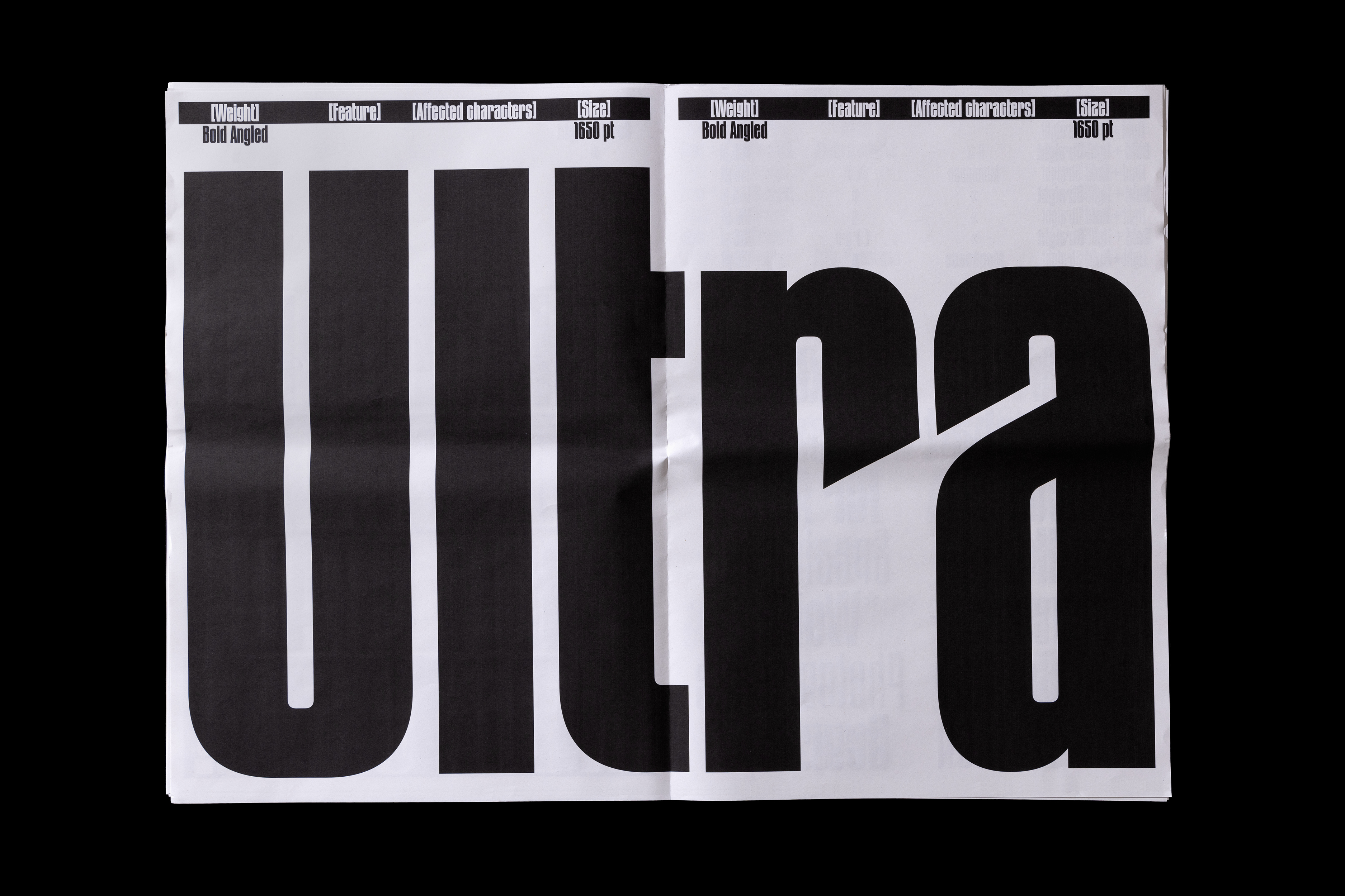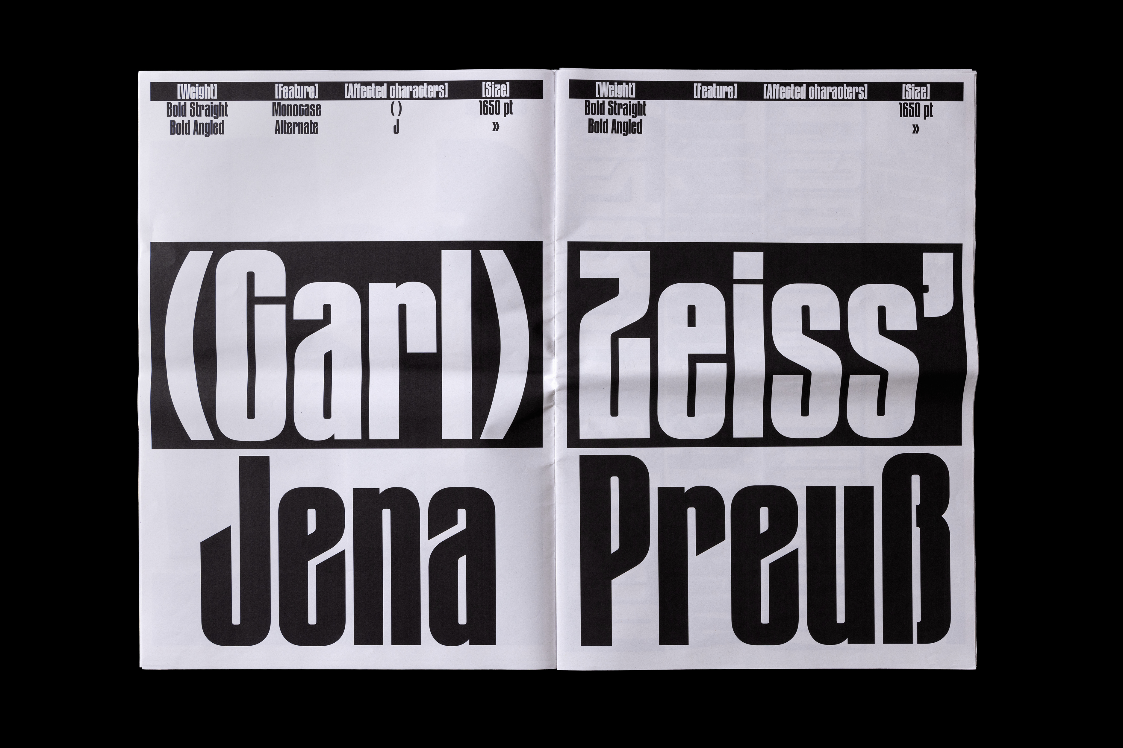 The typeface was created after Thomas found some old metal letters of a typeface entitled »Zeitungs-Grotesk« by the Bauer foundry from 1906. He was immediately fascinated by its art nouveau influences such as the uppercase »A«, diagonal endings, dense construction and interconnection. The original »Bold Angled« style has been complemented by lighter weights, italics and an entire family with straight endings making it a versatile family for a wide variety of display usage. OpenType features such as a monospace feature allows tight line spacing and creative typesetting.